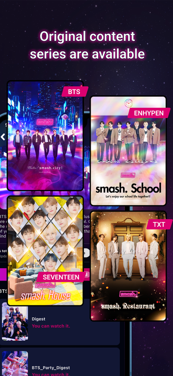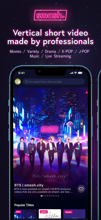 smash. to ostateczna usługa streamingowa, która pozwoli Ci oglądać oryginalne, profesjonalnie wykonane krótkie filmy w pionowym stylu za darmo. Wśród nich znajdziesz K-Pop, anime, dramaty i filmy.